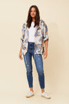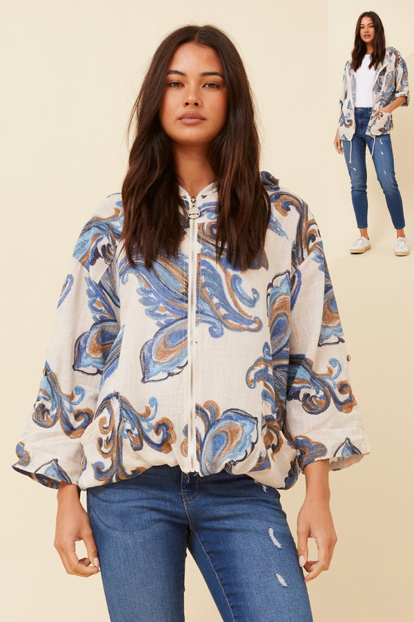 Embrace casual comfort with this 3/4 sleeve paisley print hoody jacket. Crafted from a soft cotton and linen blend, it offers breathability and effortless style. The front zip lets you easily adjust your look, while handy front pockets add a practical touch. Perfect for layering on breezy days with a playful twist.