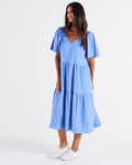 The Regina Linen Dress is a springtime essential, offering a breathable viscose/linen blend with flutter sleeves and a V-split neckline. This midi-length dress is both comfortable and elevated for everyday wear.