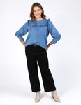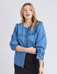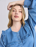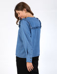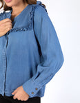 The ultimate in pretty denim dressing. The new Frankie Blouse brings the chic to your denim wardrobe this season. Featuring a pretty ruffle trim around the neck and arms and a hidden button down front, we'll be wearing this lovely shirt with our favourite denim jeans for a double denim look.