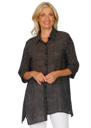 This playful splice stripe shirt features an A-line silhouette with a handkerchief hem and 3/4 sleeves. Crafted from a soft blend of 70% rayon and 30% nylon, it buttons down the front for easy wear and style.