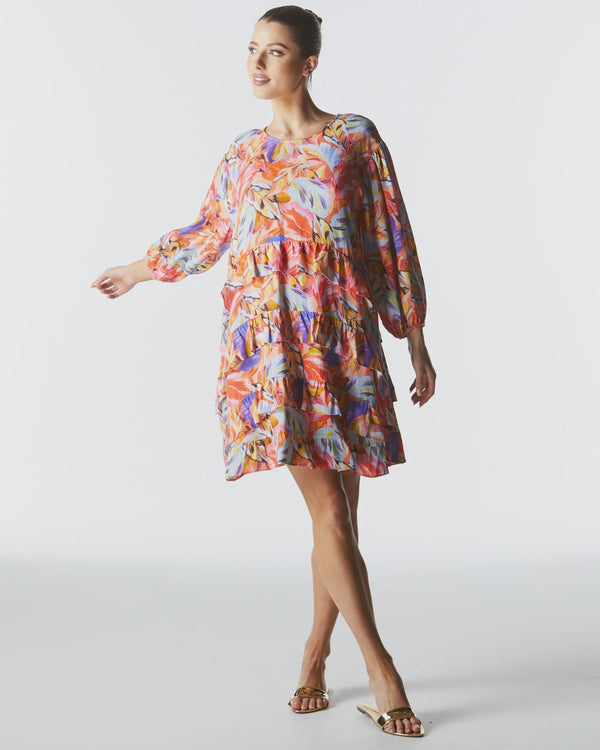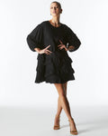 The Midsummer Mini Dress brings playful sophistication with tiered ruffle details, a back neck tie, and a relaxed fit. Elasticated sleeves add a touch of easy elegance to this versatile piece.