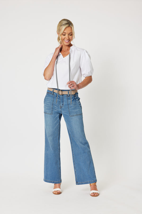 The ultimate fit meets ultimate function with these high rise, wide leg jeans Enjoy all-day comfort with the lightweight stretch denim fabric With functional deep patch pockets, and double button...