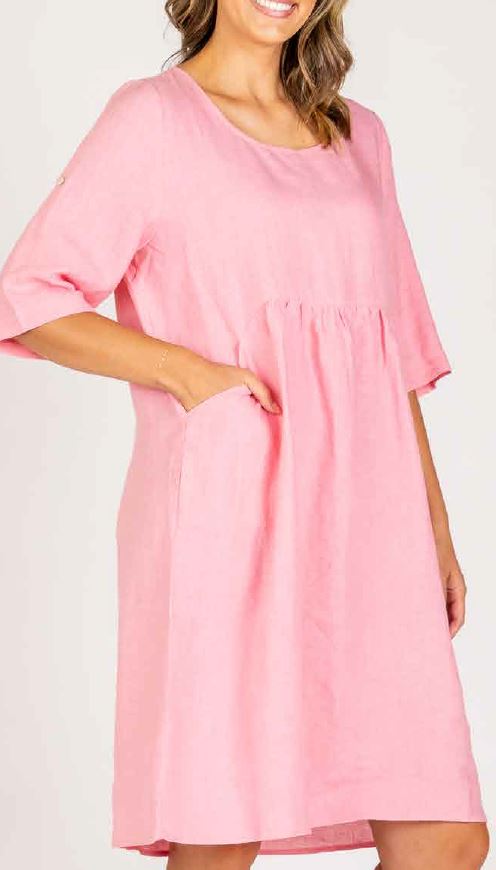 Step into effortless charm with the Lux Tuscan Dress, crafted from breathable 100% linen for all-day comfort. Its playful baby doll front adds a flirty touch, while the versatile 3/4 sleeves roll up easily with a handy tab and button. Two front pockets keep essentials close or add a casual vibe to your look. Perfect for sunny days and playful adventures.