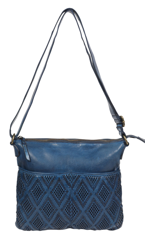 This vintage cow leather crossbody bag is a stylish companion with a laser-cut front pocket and a handy zip pocket at the back. Inside, you'll find a zippered compartment plus two spots perfect for your phone. Measuring 29cm by 24cm, it’s just the right size to carry your essentials with a fun twist.