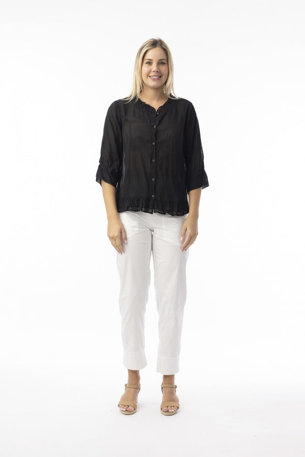 Embrace effortless style with our Cotton Gauze Essentials Button-through Top. Made from 100% organic cotton, this lightweight and breathable piece features a relaxed fit, a chic mandarin collar, three-quarter length sleeves, and a delicate frill at the hem for a touch of femininity. The button-through front adds versatility, making it an easy go-to for everyday comfort and conscious style.