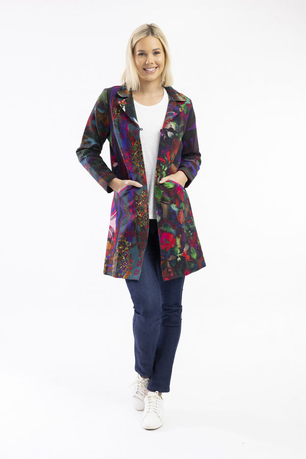 Our classic digital coat is a fun statement piece for your winter wardrobe. This coat falls just above the knee and features gorgeous intricate prints, bright and vibrant colours, and single breasted button detailing. Created using heavy luxurious 100% organic cotton fabric, this coat will keep you warm during the winter months while also supporting sustainability.