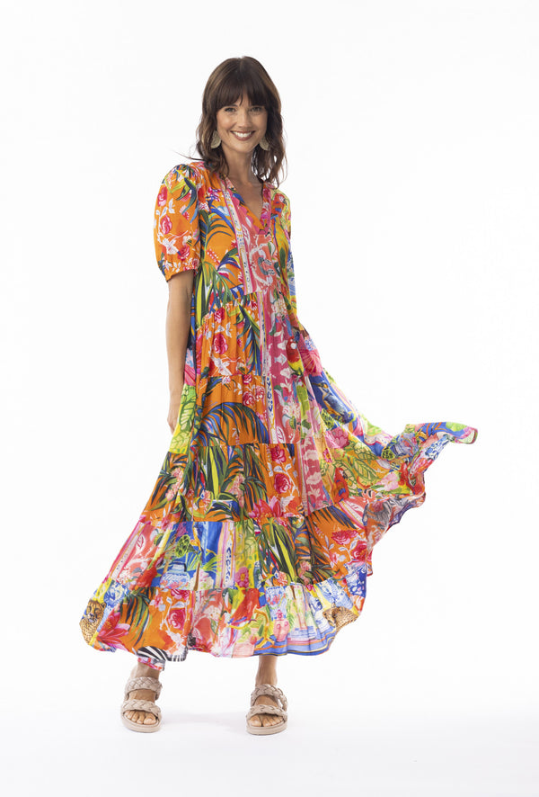 Unveil your grace with the radiant Stefania V Maxi Dress. This dress features a flattering v-neckline, gathered half sleeves, and gathered seams at the bust which fall into a beautiful tiered skirt, creating a feminine silhouette. Vibrant, colourful prints makes this the perfect summer dress!