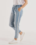 The Brooks Jean offers a flattering mid-high rise fit crafted from stretch knit denim for ultimate comfort and style. It features an elasticated waistband and trimming along the side leg, combining practicality with a sleek, modern look.