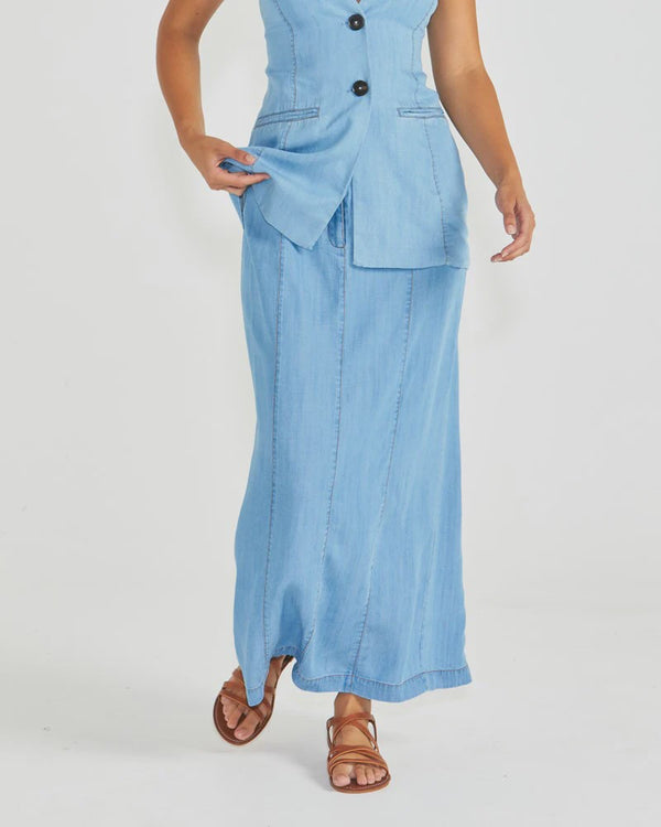 The Seville Maxi Skirt features a panelled design and a fly front with belt loops, offering an elevated yet relaxed look that's perfect for any springtime occasion. Comfortable and stylish, it's a must-have.