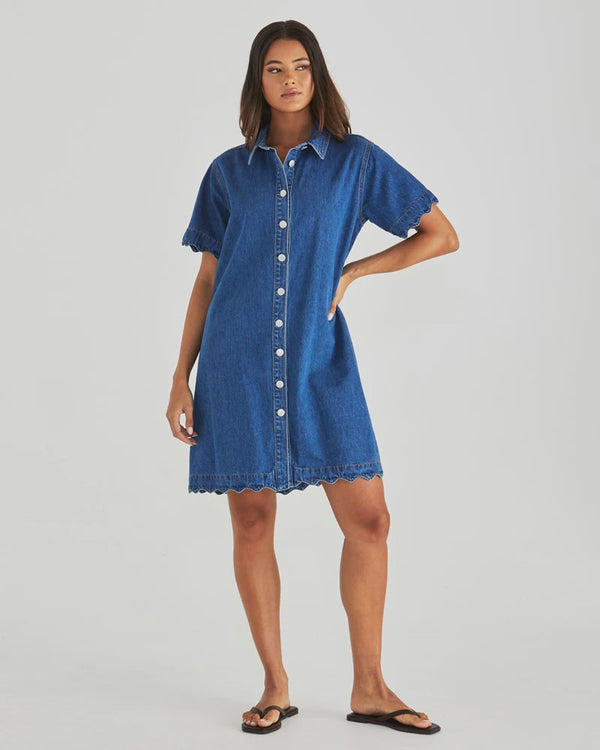With sweet scallop edging and soft denim, the Vale Dress is made for sunny days. Metal buttons and practical pockets keep it grounded, while the details give it that elevated edge.