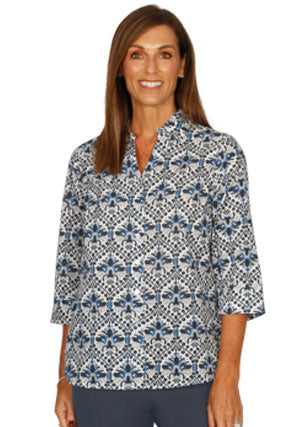 This playful Sophia print shirt features 3/4 sleeves with fun cuffs and sleeve splits, a hemline split for movement, and buttons down the front for easy style.