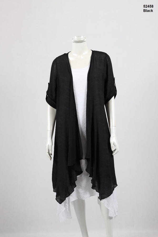 Experience laid-back charm with this cotton linen cardi featuring trendy 3/4 tab-up sleeves that let you play with your look. The handkerchief hem adds a whimsical, flowing silhouette that moves with you, while the relaxed fit ensures comfort without compromising style. Perfect for layering over your favorite tops or dresses, this cardi brings a fresh, playful vibe to your wardrobe. Whether you're heading out for a casual brunch or a breezy afternoon stroll, it’s designed to keep your outfit effortlessly cool and comfortably chic.