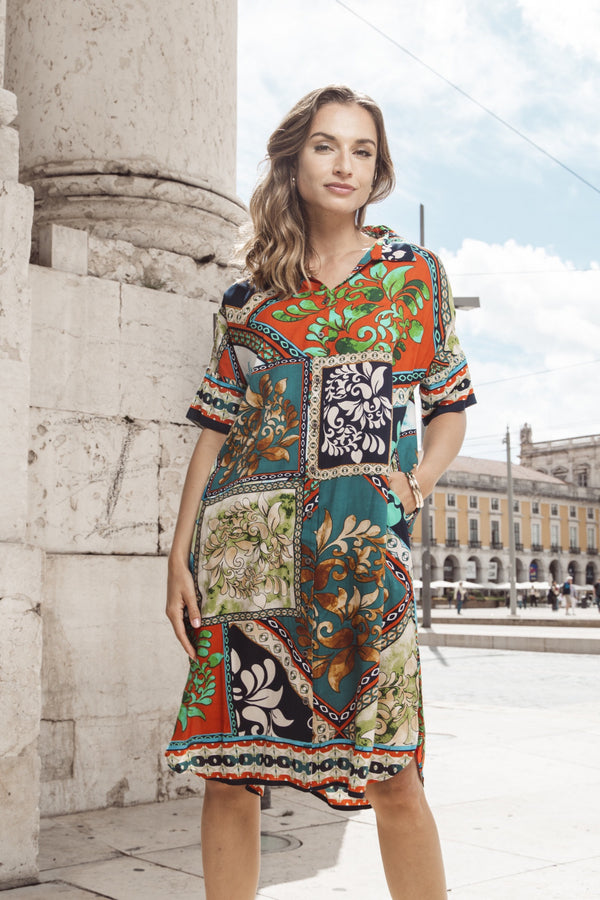Step out in our stylish garment, the Cabo Fria Shirt Dress! Featuring half sleeves, midi-length, button through style, and a vibrant print, this dress is perfect for relaxed sunny days. Its easy-going style effortlessly combines comfort and style.
