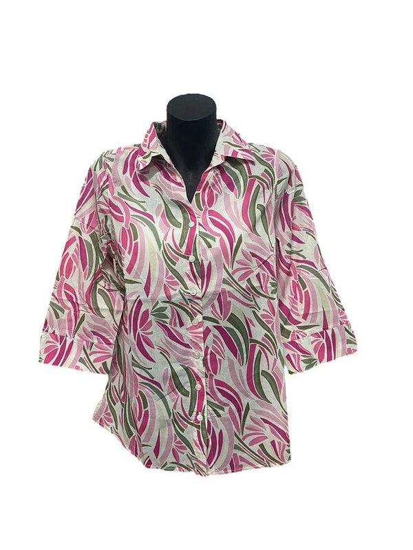 This playful print shirt features 100% cotton fabric, comfy 3/4 sleeves, a stylish collar, and side splits for a breezy, fun look.