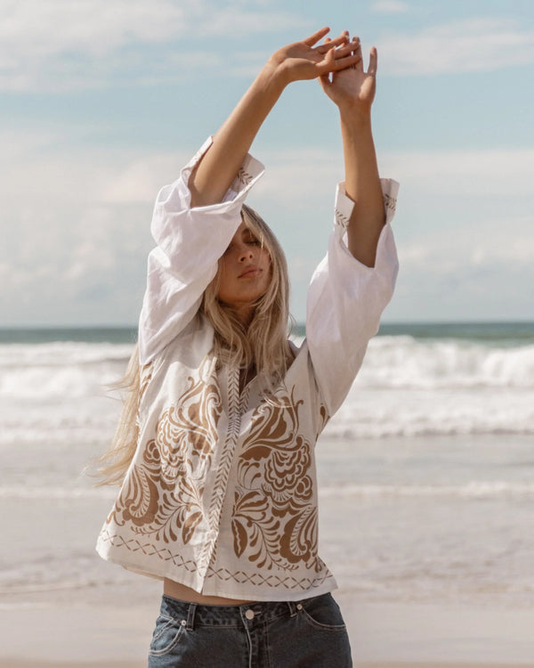 With its 3/4 sleeves and collared neckline, the Brandy Top is a playful piece that’s both comfortable and on-trend. The print placement detail and button-front closure add charm, making this top a perfect choice for both casual outings and dressed-up days.