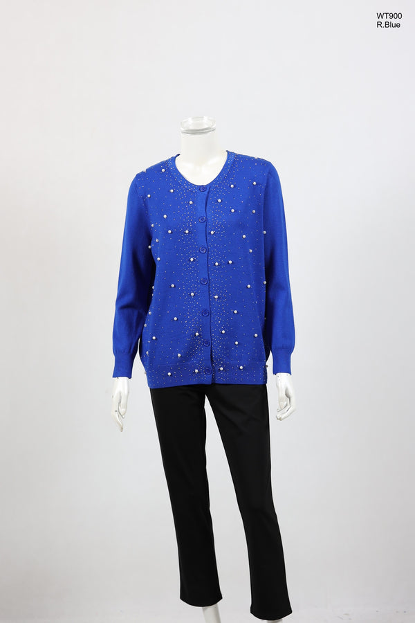 Knit cardigan featuring elegant pearl and diamante embellishments for sophisticated detailing. This versatile piece offers practical side pockets and a classic round neckline with full button-through closure. Crafted from a premium blend of 80% rayon, 15% wool, and 5% elastane, ensuring exceptional drape, warmth, and shape retention. The luxurious fabric composition provides both comfort and durability while maintaining a polished silhouette that transitions effortlessly from day to evening wear.