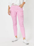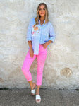 This is a classic denim jogger made from the softest cotton denim you can find. They have so much stretch you can literally do yoga in them! With an adjustable inner elastic waist tab - you can tighten the waist band to suit your body shape for ultimate comfort. Gather detail around knee area so they don't sag away from your body. Adorable patchwork placement that actually make your thighs look thinner