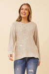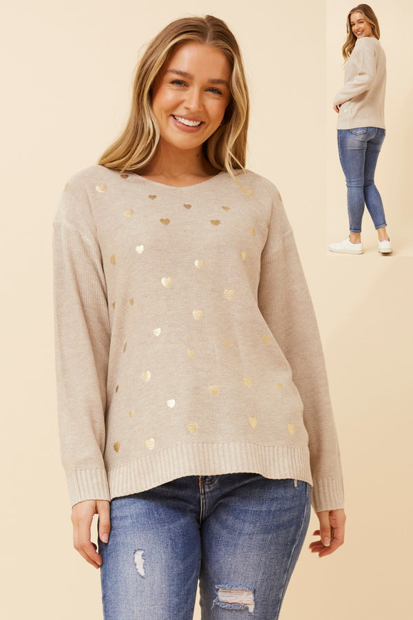 This playful light weight jumper features a charming gold foil heart print that adds a touch of sparkle to your everyday look. Designed with a flattering V-neck and relaxed drop sleeves, it offers both style and comfort. The ribbed hem and cuffs ensure a snug fit, while the 100% polyester fabric keeps it soft and easy to care for. Perfect for brightening up casual outfits with a fun, flirty vibe.