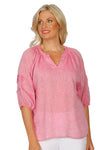 This playful linen blend top mixes 45% cotton with 55% linen for a breezy feel. Featuring a fun 3/4 sleeve and a cheeky V-neck, it’s perfect for adding a fresh twist to your wardrobe.