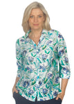 The Audrey print shirt features a sophisticated 3/4 sleeve design and a classic collar, offering both style and comfort throughout the day. Its button-through front allows easy wear and adds to its polished look. Side splits enhance mobility and provide a relaxed fit, making it suitable for both professional settings and casual outings. Crafted to combine elegance with practical detail, this shirt is a versatile addition to any wardrobe, perfect for layering or wearing on its own.