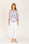 The Pablo shirt features playful 3/4 sleeves with buttoned cuffs and a classic collar. It buttons down the front and has a curved hem that hits just below the hips. Made from 100% cotton for a soft, comfy feel.