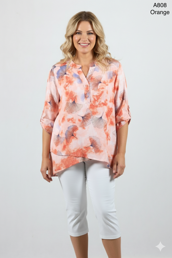 This playful 3/4 sleeve top features a clever tab that lets you flip it up to a short sleeve style, perfect for adapting to any mood or weather. The flattering crossover front and V-neck with a button placket add a touch of charm and versatility to your look. Finished with a stylish high-low hem, it pairs effortlessly with jeans or skirts. Made from a soft and breathable blend of 30% rayon and 70% cotton, this top feels as good as it looks, keeping you comfortable all day long. A fun and flexible staple for your wardrobe!