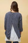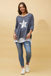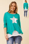 This playful 3/4 sleeve top features a double-layer design, a sparkling sequin star, and a stylish hanky hem, with buttons running down the back for a fun finishing touch.