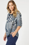 This 3/4 sleeve abstract tunic style top brings a splash of artful fun to your wardrobe with its lively pattern and flattering curved hem. The boat neckline adds a touch...