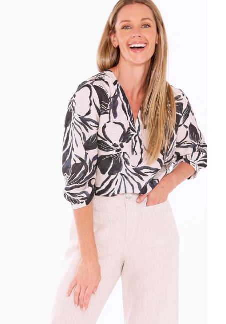 The Mono Bloom Top is crafted from a soft linen blend, offering a lightweight and breathable feel.