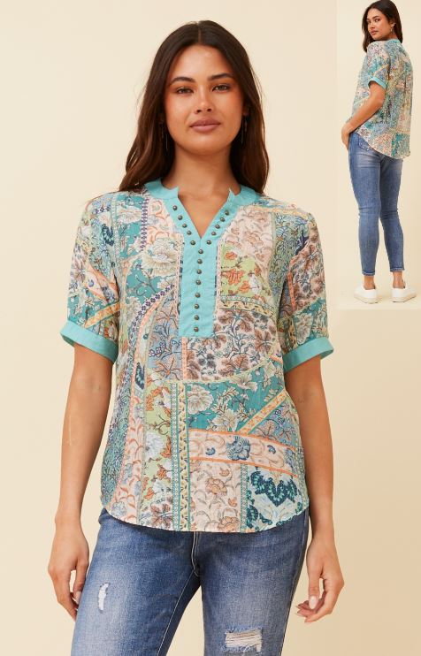 Our patchwork stud top is a great addition to your holiday collection! Pair it with solid linen pants and sandals to complete the look, or match it with jeans and sneakers for a stylish day out in the city.