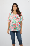 This short sleeve 100% cotton print top brings a playful twist to your casual wardrobe. Featuring a rounded neckline and bat wing sleeves, it offers a breezy, relaxed fit that moves with you. The hi-low rounded hem adds a flirty edge, perfect for pairing with jeans or skirts. Lightweight and comfortable, it's an easy go-to for effortless style with a fun flair.