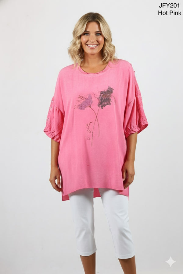 Meet your new go-to top! Crafted from soft cotton with a breezy loose fit and drop sleeves that feel like a warm hug. The raw-edge neckline gives it an effortlessly cool vibe, while side splits add just the right amount of movement and flair. Elastic cuffs and the garment-dyed finish means each piece is beautifully unique. Top it all off with charming embroidery details dancing across the back and sleeve—because why blend in when you can stand out?