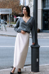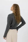 Rolled V-neckline with fixed wrap detail.