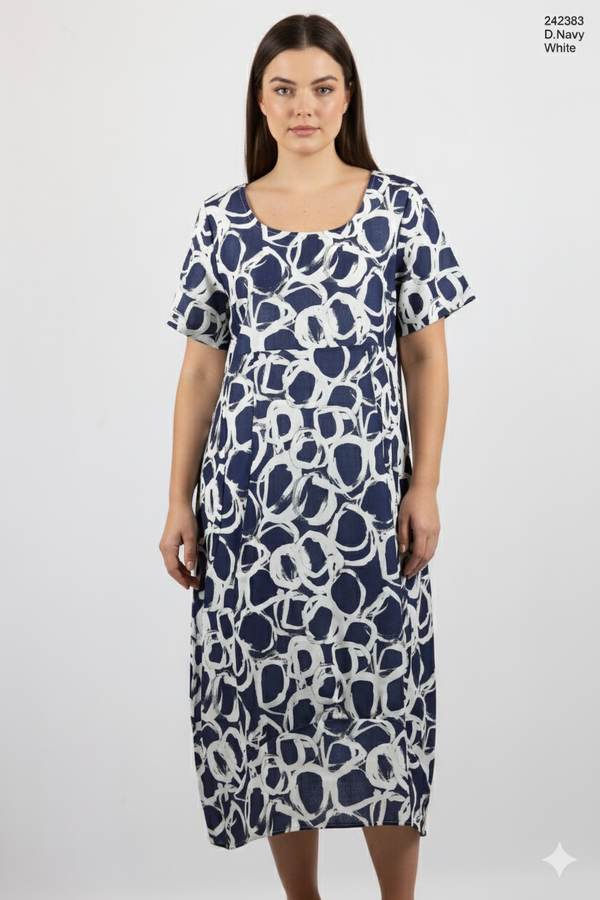 This playful dress crafted from a delightful blend of linen and cotton offers breathable comfort with a soft texture perfect for warm days. Its short sleeves and round neckline add a touch of casual charm, while the mid-length cut balances ease and elegance. Front pockets bring a fun and practical flair, ideal for keeping small essentials close by. The shaped style gently hugs your figure, creating a flattering silhouette that moves with you. Whether you're out exploring or enjoying a relaxed day, this dress makes comfort look effortlessly stylish.