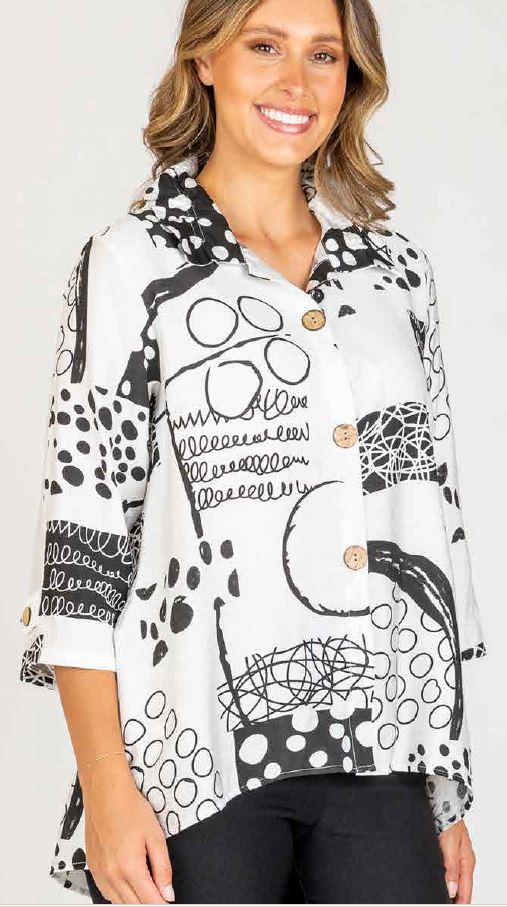 This playful maria wire collar shirt lets you style the collar up or down for a fresh look every time. Featuring 3/4 sleeves with charming button accents and hidden side pockets, it blends practicality with fun. Made from a soft mix of 70% viscose and 30% nylon, its A-line silhouette is finished with natural wooden buttons for a touch of whimsy.