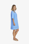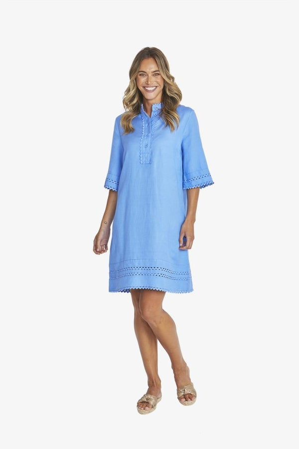 Brighten up your wardrobe with the playful charm of the Rickie Dress. Crafted from a breathable linen/viscose blend, this shift dress comes in a fresh sky blue hue and is finished with whimsical ric-rac trims for a touch of vintage-inspired flair. Featuring a high neckline, half button placket, and an easy, relaxed fit, it’s the perfect throw-on-and-go piece for warm days.