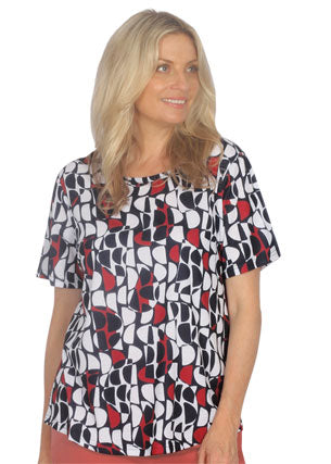 This playful t-shirt blends 95% polyester with 5% elastane for a comfy stretch that moves with you. Featuring short sleeves and a round neck, its scoop bottom adds a fun, flirty touch to your everyday style. Perfect for effortless comfort with a twist!