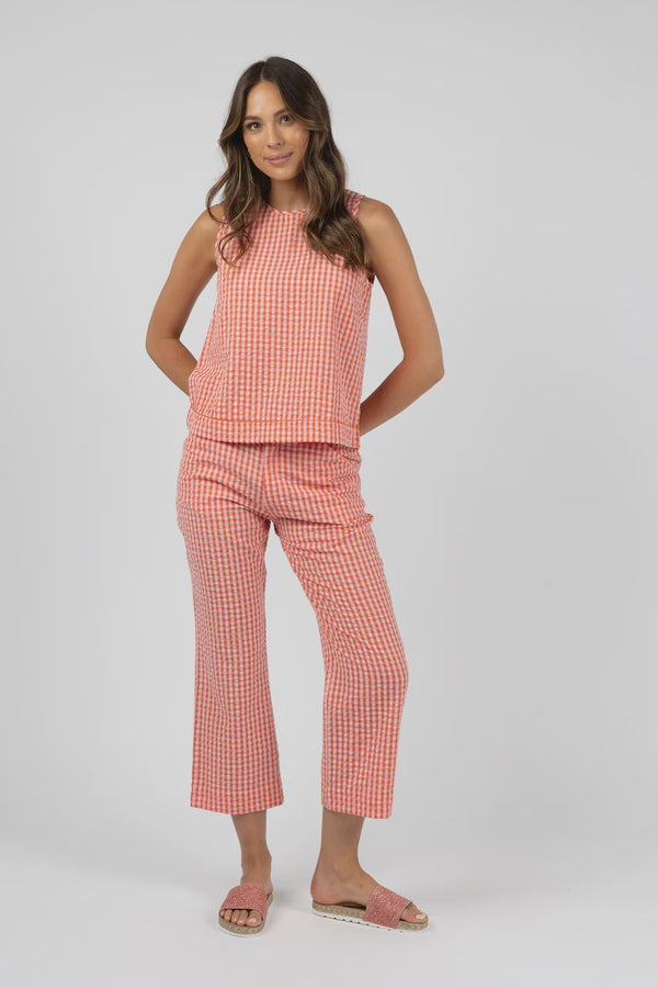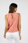 Cute little tank style top.Higher cut, rounded neckline – bind finish on neck and armhole.Back-neck split with self-fabric tie feature. Bra friendly.Wide hem with piped detail finish.Cool and comfortable 100% cotton...