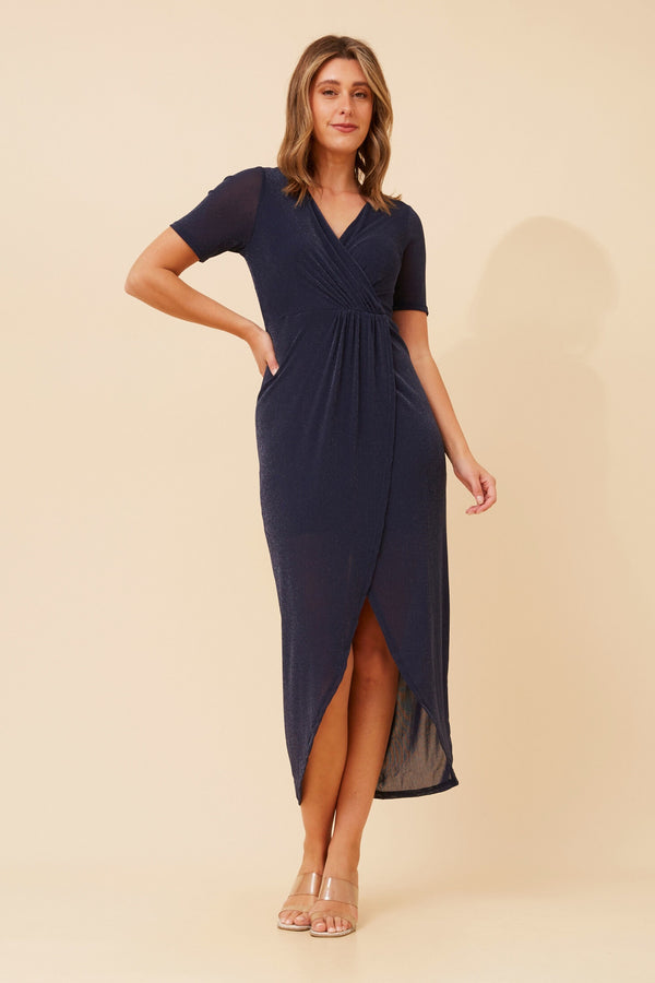 Feel glamorous in our shimmer Dress. Style with your elegant heels and a clutch purse for an evening look this season! Wrapped V-neckline Short sleeves Shimmer fabric Lurex/metallic detail Front...