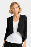 Sharply-styled bolero that offers clean lines and timeless sophistication. The cropped front pulls in pointedly at the waist while the back falls below the hips, accentuating its figure-hugging fit. Covered buttons adorn the three-quarter sleeves.