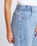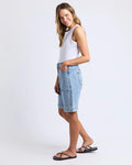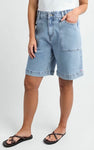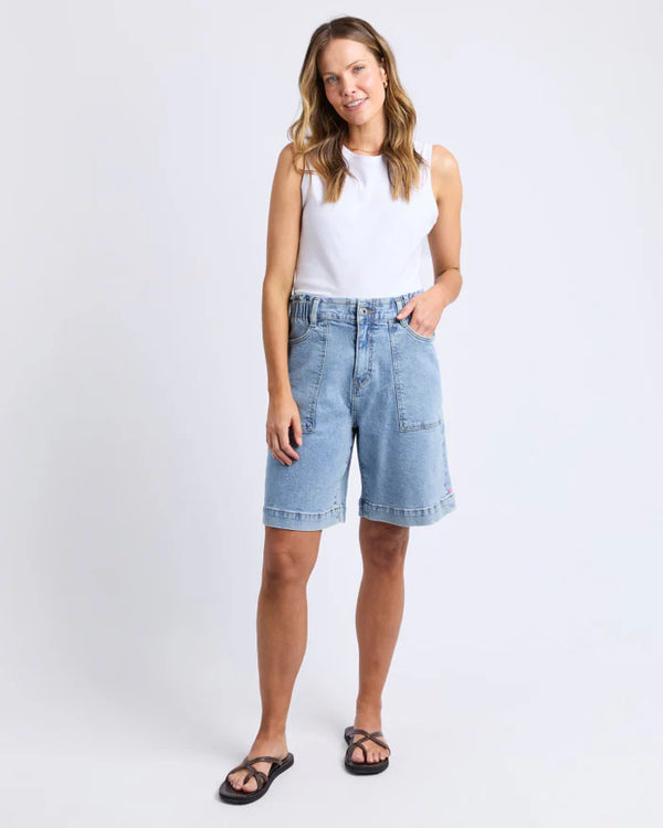 Get ready to move freely in these laid-back denim shorts! The stretchy elastic waist keeps you comfy all day long, while the zip and button fly adds that classic touch....