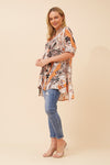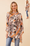 This longline button-up shirt pairs fabulously with tights or jeans for an effortlessly cool vibe. Featuring long sleeves and a fun mix of orange, brown, and white prints, it’s cut longer at the back for extra flair. Crafted from a soft polyester and silk blend, it’s as comfy as it is stylish.
