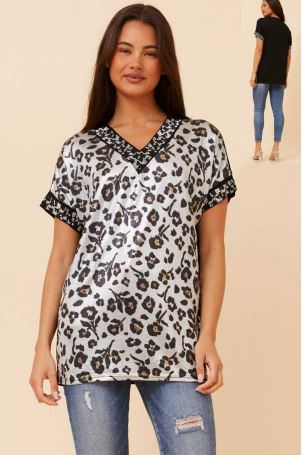 Make a statement with this fun short-sleeve top that pairs a bold animal print front with a soft lurex stretch blend for all-day or night comfort. The understated plain jersey...