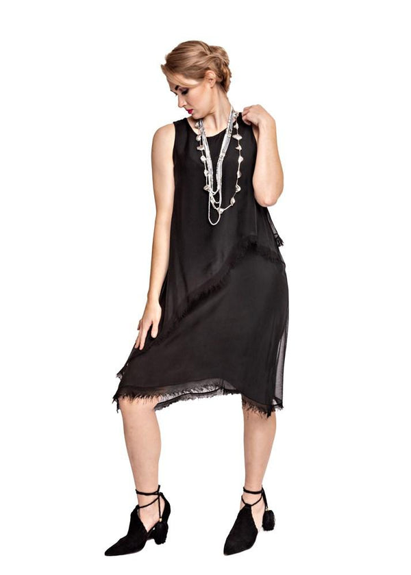 Vita dress by Imagine. Fabulous lined sleeveless dress with an angled overlay hemmed with a frayed edge, falling down to an uneven hem also with a frayed edge giving it...